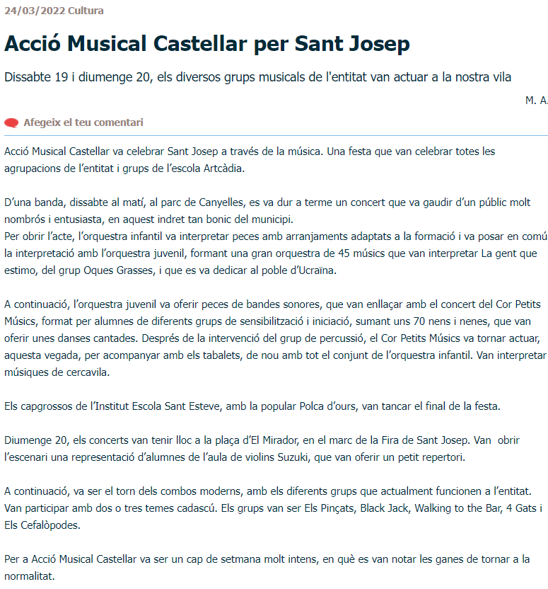 6a edició “Petits Concerts de Sant Josep” Publicat perArtcàdia24/03/2022Publicat enArtcàdia Comparteix això: Feu clic per compartir a X (S'obre en una nova finestra) X Feu clic per compartir al Facebook (S'obre en una nova finestra) Facebook M'agrada S'està carregant... Relacionats