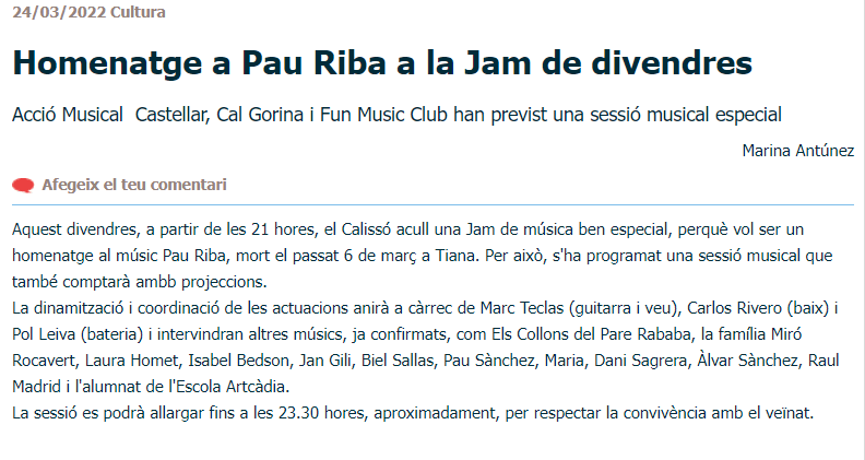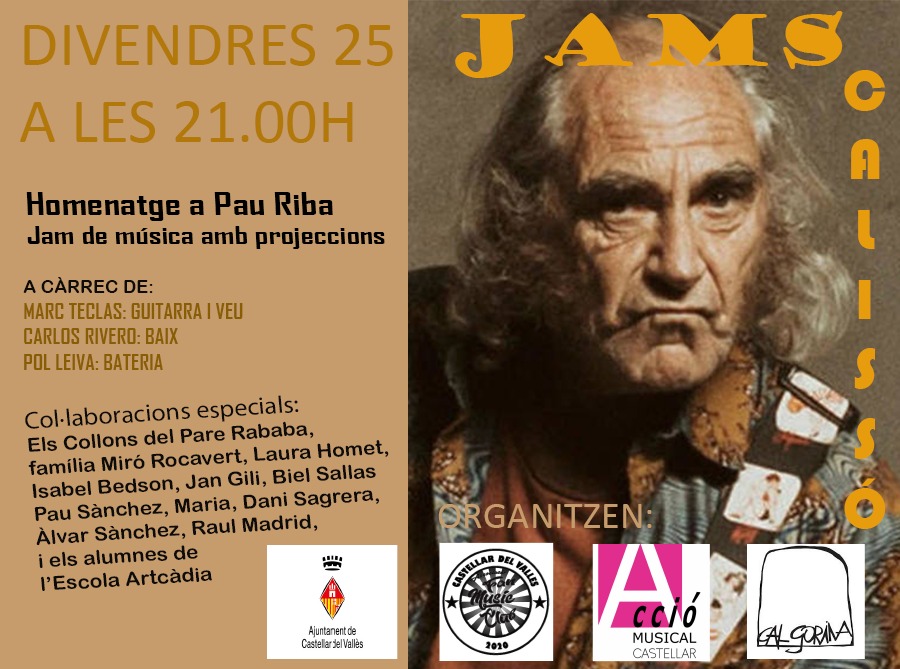 JAM Homenatge a Pau Riba Publicat perArtcàdia24/03/2022Publicat enArtcàdia Comparteix això: Feu clic per compartir a X (S'obre en una nova finestra) X Feu clic per compartir al Facebook (S'obre en una nova finestra) Facebook M'agrada S'està carregant... Relacionats