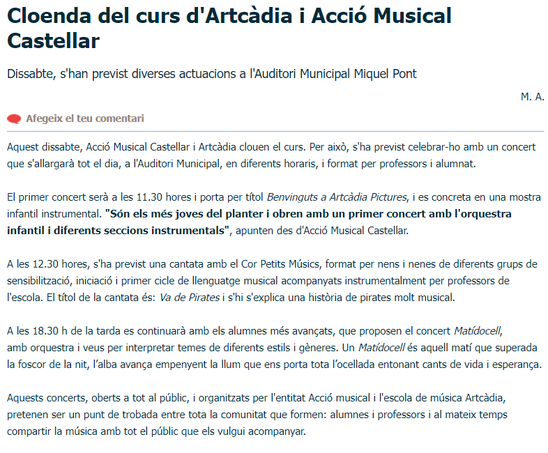 2n CONCERT: Secció “De Cambra Amateur” concert a càrrec d’ alumnes de l’ Artcàdia d’entre 15 a 20 anys. Aquests alumnes prèviament rebran una masterclass durant 2 dies amb Joan Ramon Company. Concert 27 de març a les 18.30h a l’Auditori municipal.