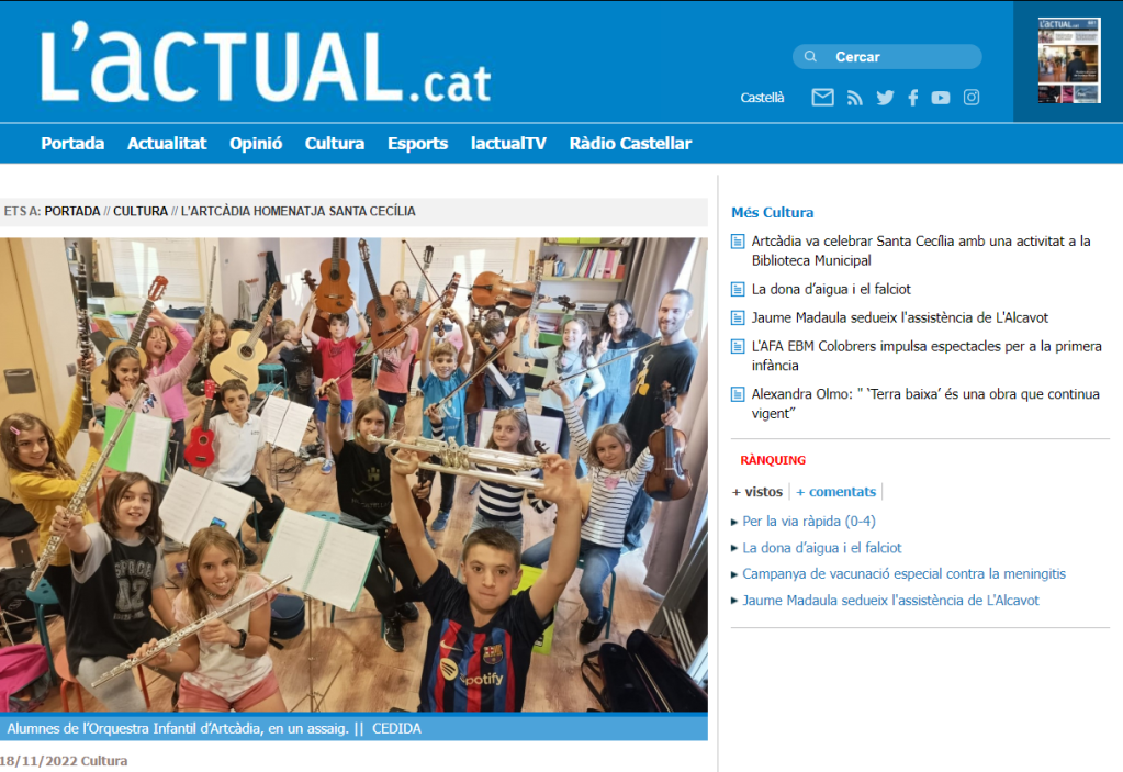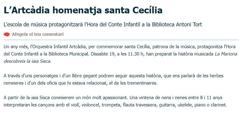 A les 11.30h del dissabte 20 de novembre la Bibioteca Municipal Antoni Tort es va omplir de goma a gom per gaudir de l’ HORA DEL CONTE. Un any més per celebrar Santa Cecília, l’Orquestra Infantil va ser la protagonista de la sessió. Aquesta vegada, una història de creació pròpia que coincidint amb el dia internacional dels Drets dels Infants, ens va explicar la importància de conèixer aquests drets i el treball col·lectiu necessari per garantir-los. “Saps quin diu és avui Blai?” era el títol del conte musicat pels més joves de l’ escola que ens van interpretar temes com el Can-Can de Offenbach. Molt bona feina nois i noies!