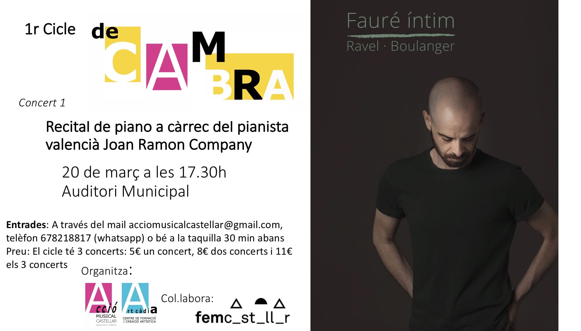 1r CONCERT: RECITAL DE PIANO “ Fauré intime” pel pianista valencià Joan Ramon Company. 20 de març a les 17.30h a l’Auditori municipal