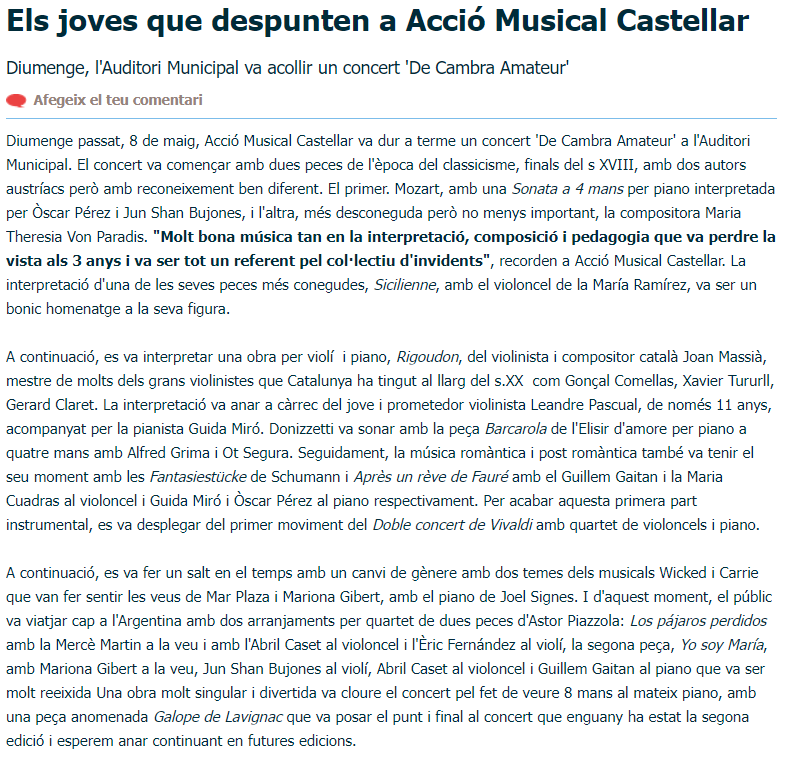 3r CONCERT: Secció “De Cambra Joves emergents” per joves d’alta formació, estudiants de l’últim curs de l’ IEA Oriol Martorell. Els instruments que trobarem són:Piano, violí, trompeta i violoncel. Concert 15 de maig a les 18.30h a l’ Auditori municipal